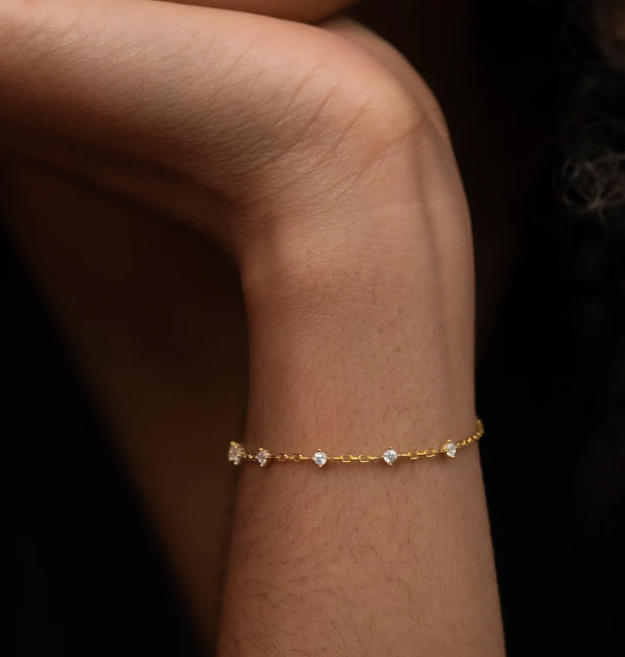 Delicate, elegant, and timeless – the Gold Dainty 6-Stone Bracelet is the perfect addition to any jewellery collection. Featuring six dazzling Moissanite stones, this minimalist bracelet embodies sophistication and grace, making it ideal for both everyday wear and special occasions.